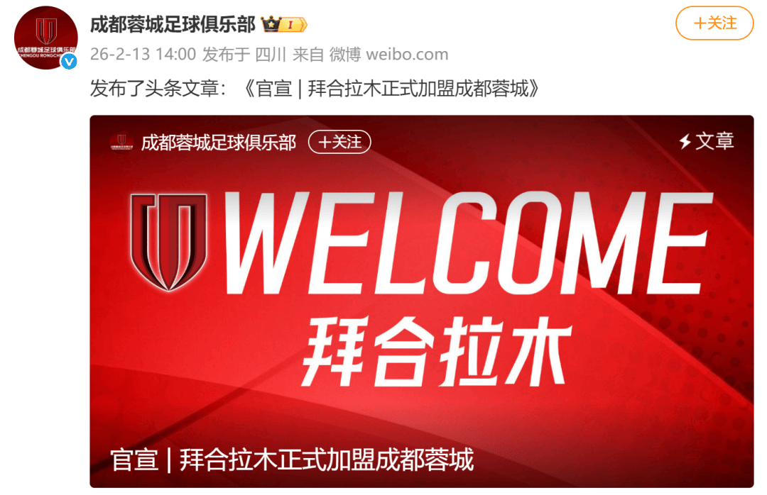 渝超联赛-重庆城市足球联赛赛程-直播比分入口成都蓉城官宣22岁拜合拉木加盟其曾获“中国金童奖”此前助中国队获U23亚洲杯亚军