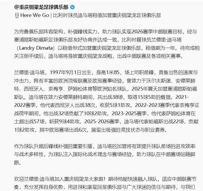 渝超,重庆城市足球联赛,渝超赛程,渝超直播,渝超积分榜,渝超球队/渝超(重庆城市足球联赛)为重庆足球迷带来最新赛程、比分、积分榜、球队信息及直播入口,精彩赛事一网打尽。当金元足球的浪潮在中超退却,重庆铜梁龙却以一笔精明的引援,给所有球队上了一课:引援不是烧钱游戏,而是精准制导的战术投资。比利时媒体walfoot独家披露的这桩转会,以250万欧元的租借费和无买断条款的细节,揭示了重庆铜梁龙的务实与智慧。他们没有追求大牌球星的虚名,而是选择了一位曾在欧冠赛场上展现过速度与实力的前锋。