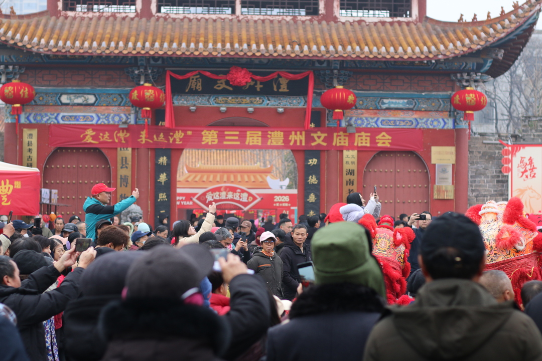 澧州文庙内,红墙黛瓦,张灯结彩。书法爱好者挥毫泼墨,市民们晾晒着墨迹未干的春联,欢声笑语不绝;泮池边,剪纸、制香、画脸谱、投壶等非遗体验区被人群团团围住;大成殿前,古雅的祭孔礼仪与坪前喧腾的舞龙舞狮、竹马表演交织呼应,智能机器人互动与科技舞蹈也巧妙融入,带来一场跨越时空的对话。