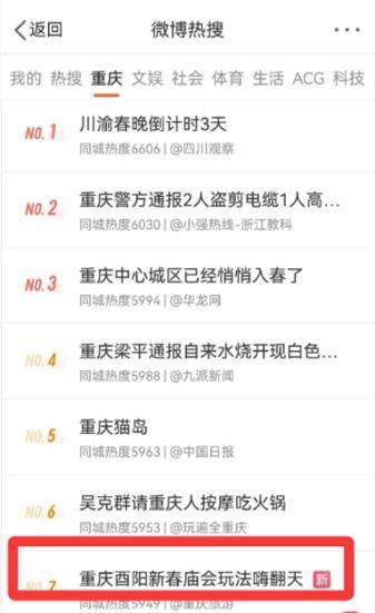 渝超,重庆城市足球联赛,渝超赛程,渝超直播,渝超积分榜,渝超球队/渝超(重庆城市足球联赛)为重庆足球迷带来最新赛程、比分、积分榜、球队信息及直播入口,精彩赛事一网打尽。马年春节将至,重庆酉阳以“赶个酉YOUNG年·新春特色庙会”为主题,联动全域景区打造沉浸式民俗盛宴,迅速点燃全国网友的过年热情,各景区活动精彩纷呈,吸引众多网友留言:“一定要去酉阳赶个酉YOUNG年。”